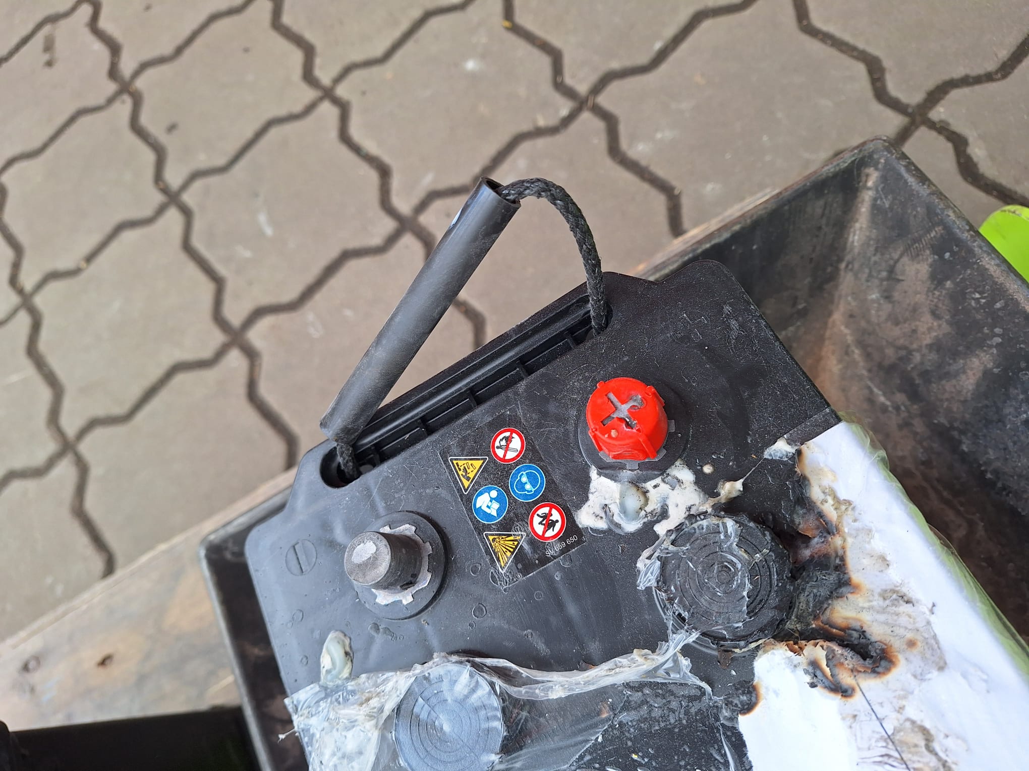 In einer Gitterbox waren mehrere Gestände gelagert, darunter zwei LKW-Batterien. Eine dieser Batterien und weitere Gegenstände wiesen leichte Brandspuren auf. Alle betroffenen Gegenstände wurde ins freie befördert und diese sowie der betroffene Bereich mit einer Wärmebildkamera kontrolliert. Nach circa 30 Minuten konnten wir die Einsatzstelle wieder verlassen.