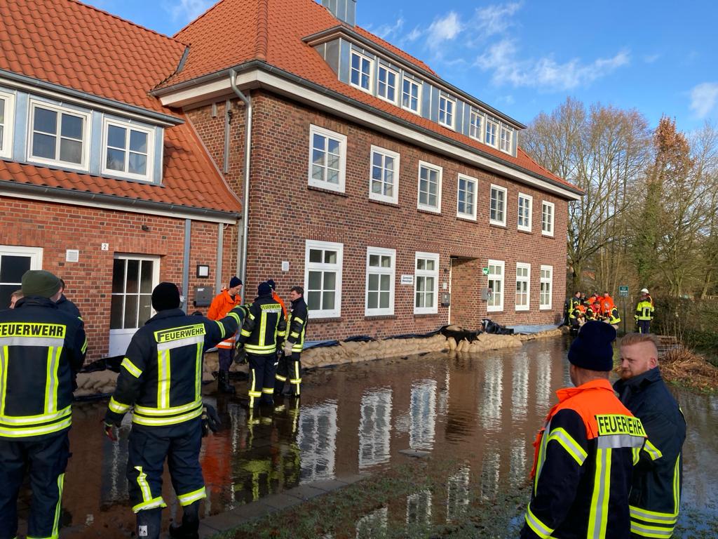 Der in den letzten Tagen schon kritisch beurteilte ehemalige Kindergarten im Ortskern musste nun heute doch noch aktiv vom Wasser geschützt werden. Die Sandsäcke welche bereits nach Heeslingen transportiert wurden mussten nun zum Einsatz kommen. Um 11:45 Uhr starteten die Verlegearbeiten in Heeslingen. Vor Ort waren über 60 Einsatzkräfte aus Hatzte-Ehestorf, Wiersdorf, Brüttendorf, Steddorf und Heeslingen. 16 der 27 angelieferten Paletten mit Sandsäcken konnten bis 13:30 Uhr in Heeslingen verbaut werden, um das Gebäude vor dem steigenden Wasser zu schützen.