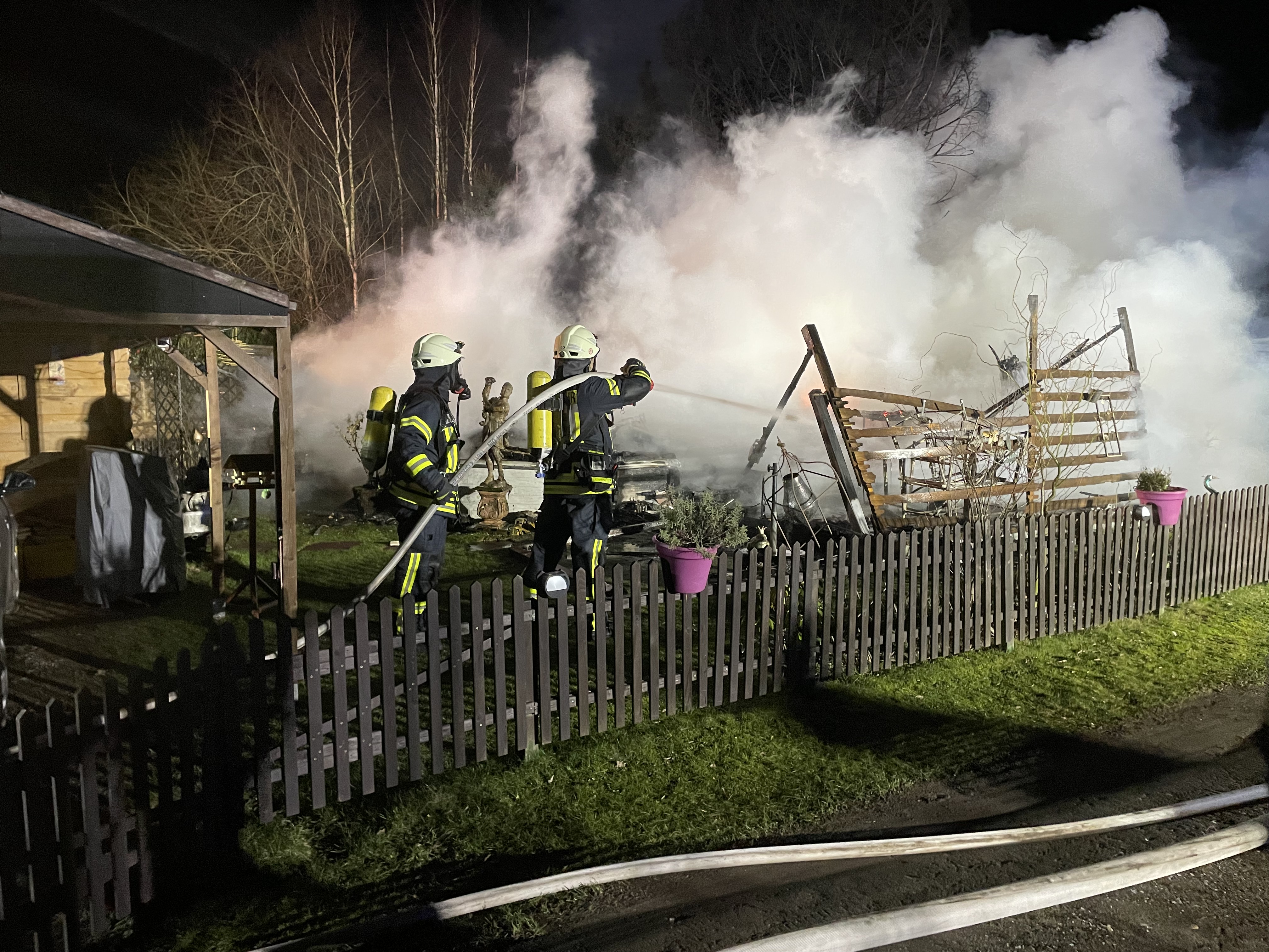 Dem zügigen Eingreifen der Feuerwehren ist es zu verdanken, dass nicht weitere Wohnwagen in Mitleidenschaft gezogen worden sind. Dem zügigen Eingreifen der Feuerwehren ist es zu verdanken, dass nicht weitere Wohnwagen in Mitleidenschaft gezogen worden sind. Lediglich eine Holzhütte und mehrere Bäume wurden in von den Flammen nicht verschont. Die Gasflasche hatte während des Brandes das Gas abgeblasen, somit war die Gefahr der Explosion gebannt. Nach rund 45 Minuten war das Feuer so weit gelöscht und es wurden Nachlöscharbeiten durchgeführt werden.