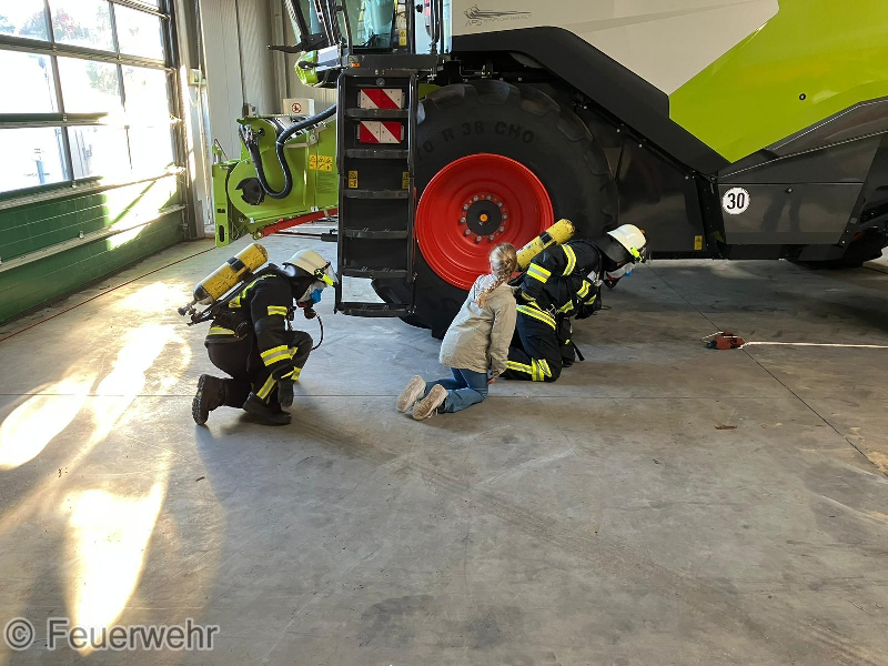 Vorort angekommen wurde durch den Gruppenführer ein Feuer im Außenbereich der Halle erkundet und es wurden innerhalb der Halle vier Personen vermisst. Die Personensuche wurde durch mehrere Trupps unter Atemschutz vorgenommen. Parallel dazu wurde eine Wasserversorgung errichtet und es wurden erste Löschmaßnahmen eingeleitet. Im Übungsverlauf wurden alle Personen aus dem Gebäude gerettet und das Feuer wurde gelöscht.